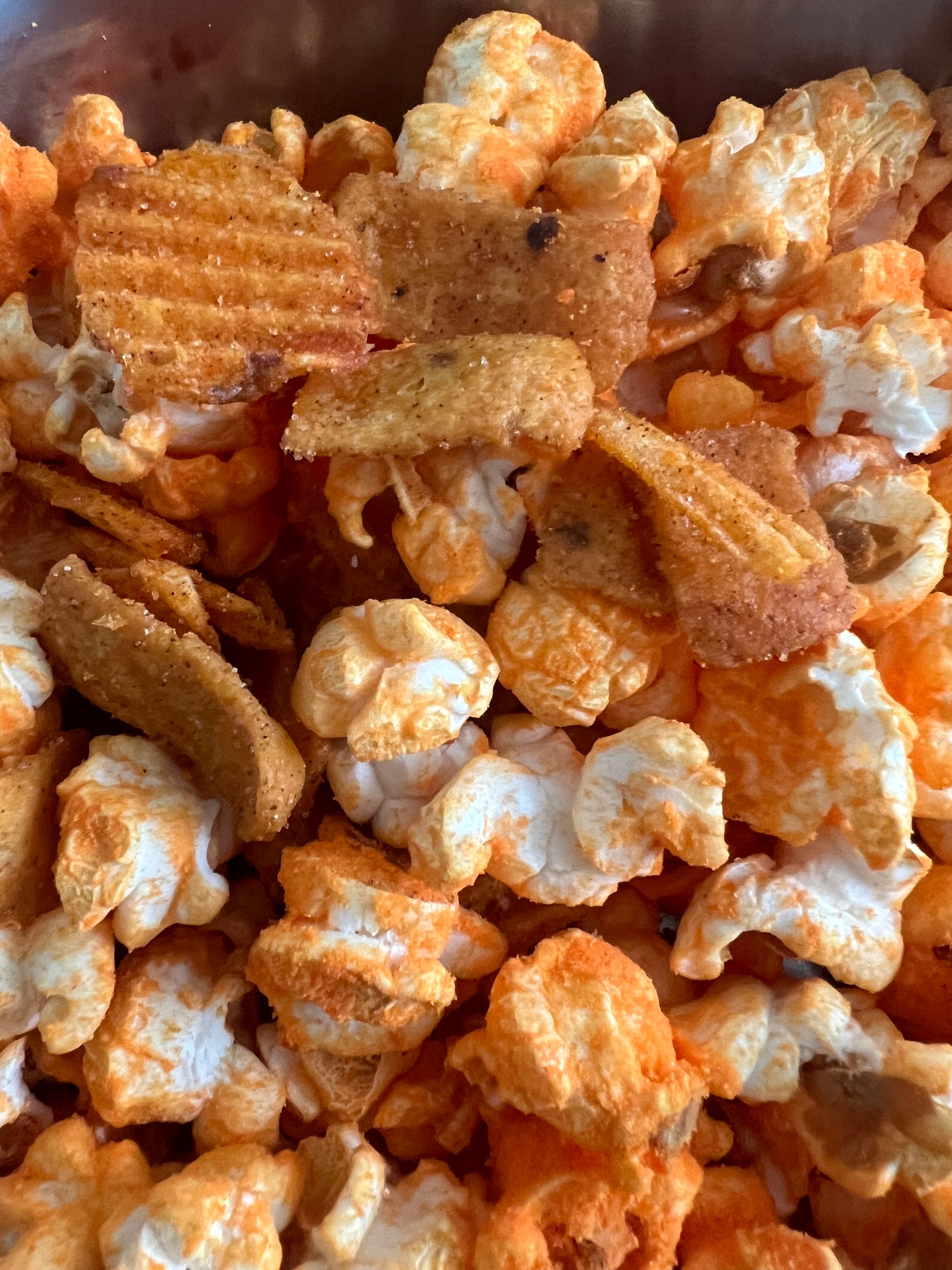 “Spicy, cheesy, and bold! This mix blends Red Hot Riplets, fiery corn chips, and cheddar popcorn for a crunch that kicks.”